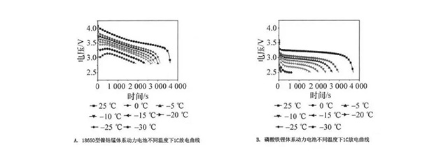 以18650型鎳鈷錳體系鋰離子動力電池、磷酸鐵鋰體系鋰離子動力電池、鎳鈷錳體系鋰離子動力電池三種鋰離子動力電池為例,先放電測試。在三種鋰離子動力電池均在25℃環(huán)境中,用恒流恒壓充電使SOC(剩余電量)達到100%,其次在不同溫度中靜置4個小時,等電池溫度與設(shè)定溫度達到一致后,進行相應(yīng)的測試。